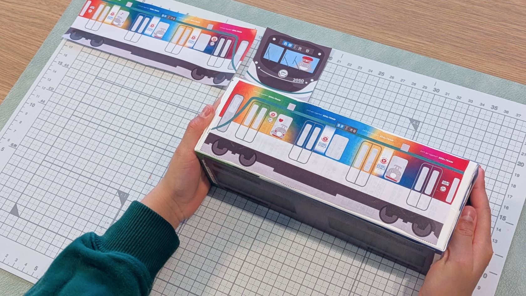 今回は、ハサミを練習中の6歳&3歳の子どもたちと一緒に作ります。選んだ図面は、SDGsトレイン『美しい時代へ号』。カラフルなラッピングのデザインが気に入ったようです。