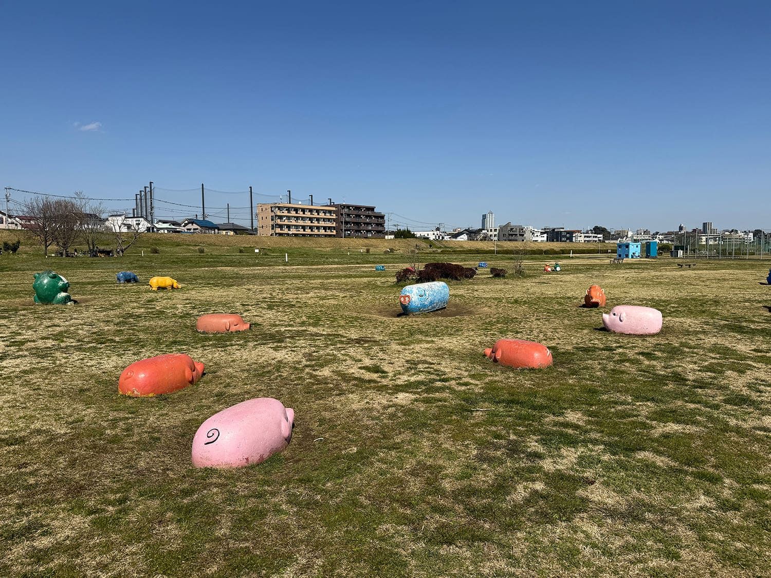 兵庫島公園から歩くこと約15分。二子玉川駅から20分ほど河川敷を歩いたところに、さまざまな動物をかたどった遊具があちこちに置かれている「二子玉川緑地運動場 ピクニック広場」に到着します。