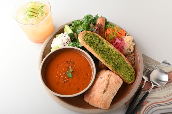 しっかりとバランスの良い食事をしたいという人に人気が高いのが、「RAW SOUPのワンプレート」。好きなスープに、サラダ、デリ、無添加ソーセージ、ガーリックトーストを盛り合わせた、見た目も美しい一皿です。