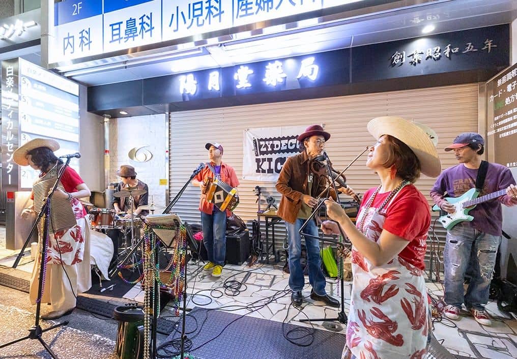 1997年から続く「六角橋商店街ヤミ市」は、白楽の夜を彩る名物イベント。毎年4月から10月の第3土曜(8月除く)には、商店街のシャッター前やスーパーの駐車場がライブ会場に変身!地域が一体となり、音楽や大道芸で盛り上がります。「ドッキリヤミ市場」から改名して、さらににぎわいが増し、多くの人が足を運ぶ注目イベントです。