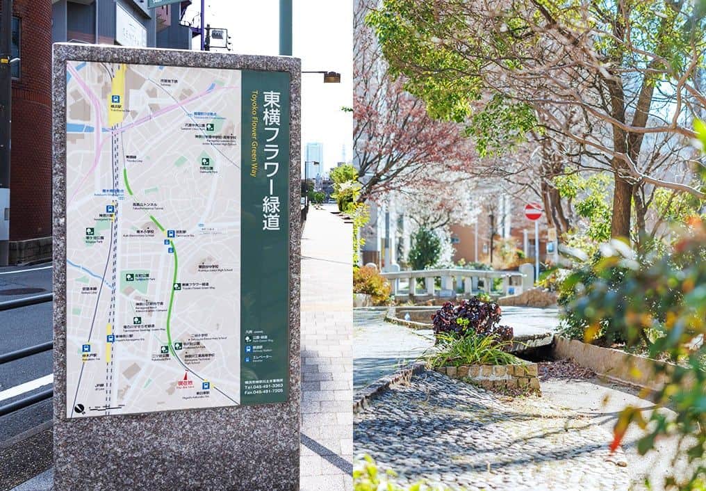 「滝の川せせらぎ緑道」は、かつて川が流れていた場所を暗渠化して整備した遊歩道。足元には波や亀のモチーフがタイルで描かれ、浦島伝説ゆかりの地らしい遊び心が感じられます。もうひとつの「東横フラワー緑道」は、地下化された東横線の線路跡を活かした約1.4キロメートルの散策路。レールの名残と季節ごとの花を眺めながら、気持ちよく歩けるスポットです。