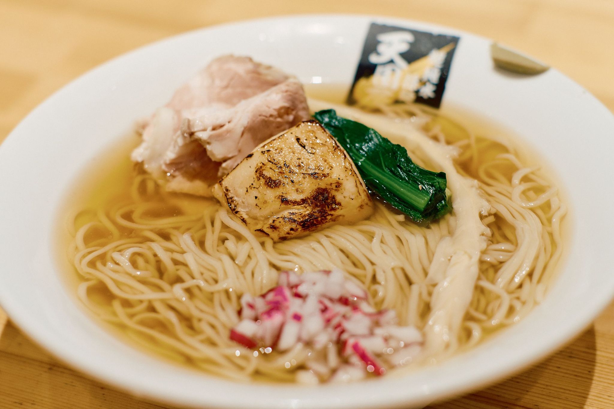 2007年、「地獄ラーメン 天国屋」としてオープン。2013年に屋号を「超純水採麺 天国屋」に変更し、メニューも一新。町田市・金森での営業を経て、2021年に南町田グランベリーパークに店舗を移転。化学調味料・添加物は不使用で「子どもに安全安心なラーメンを提供する」のがモットー。東京を代表する淡麗系の名店。