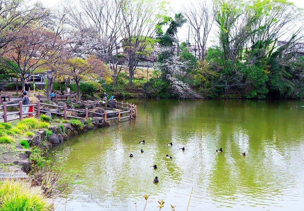 「菊名池公園」は水道道を挟んで南北に広がる、地域住民の癒やし空間です。北側には大きな池があり、野鳥の撮影や散歩を楽しむ人々の姿が見られます。南側には流れるプールや子ども用プールなどがそろい、夏休みの遊び場として人気。保育園の子どもたちが遊びに来る光景も見られ、子育て世帯の暮らしに寄り添う存在です。