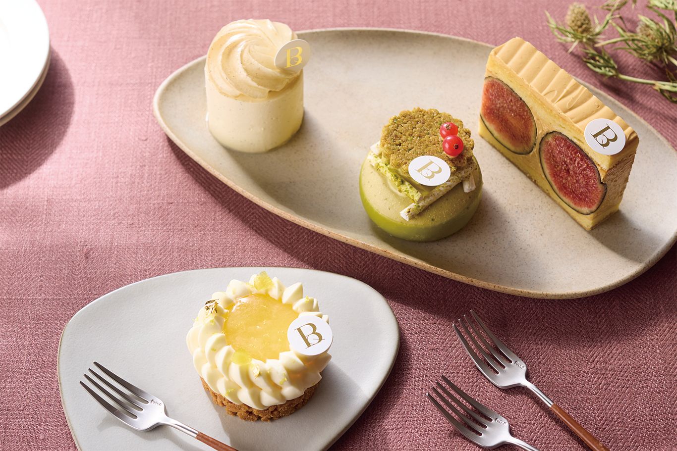手前・どこまでもフレッシュなレモンタルト「シャルマン」¥800。奥・左から、全パーツに最高級バニラをふんだんに使った「クールヴァニーユ」、ピスタチオの自家製ペーストを使うムースやクリームなどに赤い果実が甘酸っぱい「フルーク」各¥820、佐賀県「富田農園」の黒いちじく「ビオレソリエス」にキャラメルムースリーヌを合わせた「ソリエ」(¥840)。