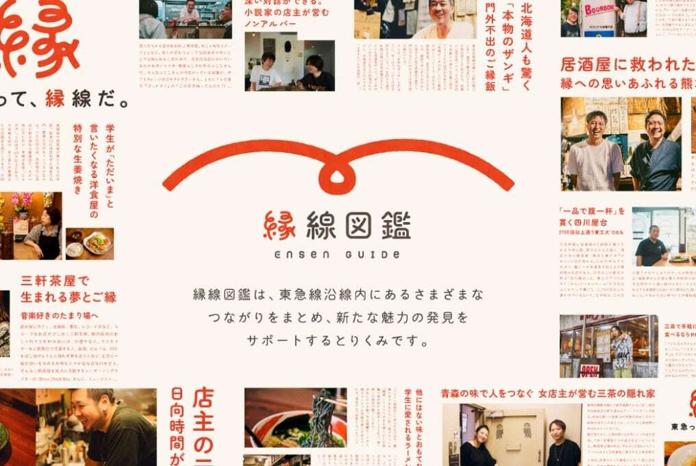 「縁線図鑑」は、東急線沿線内にある様々なつながりをまとめ、新たな魅力の発見をサポートするとりくみです。住んでいる人、訪れる人、誰もが何かしらの縁を感じられ、一人じゃないと思える。もっと、ぬくもりにあふれた沿線へ、ともに出発しよう。