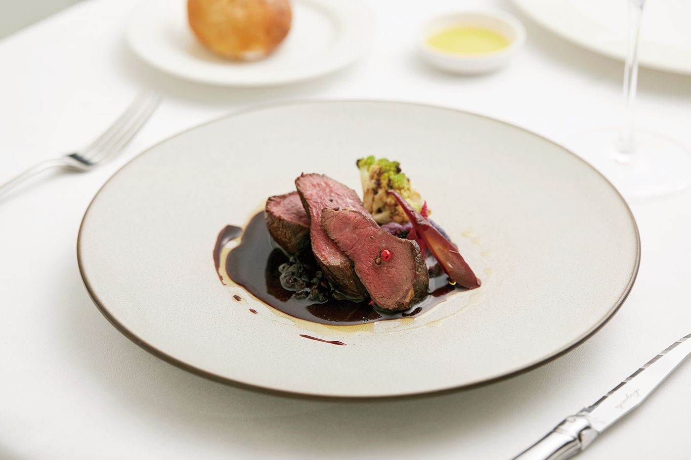 ○お任せのディナーコース「Menu B」(¥12,000)より、「和鹿のロースト ワイルドベリーのソース」。和鹿はえぞ鹿と比べて雑味が少なく、あっさりとした味わい。女性に人気。