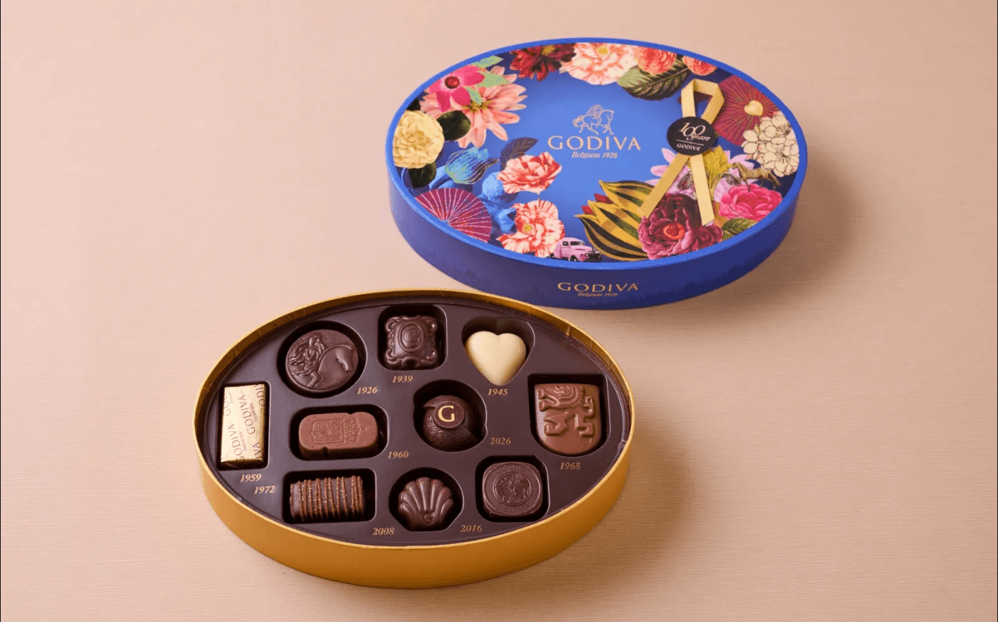 創業の1926年から最新の2026年まで、〈ゴディバ〉の歴史の中でも代表的な10粒を詰め合わせた、ひと箱で100年の変遷を楽しめるアソートです。過去の粒に関しては、当時のレシピをもとにして復刻させました。
