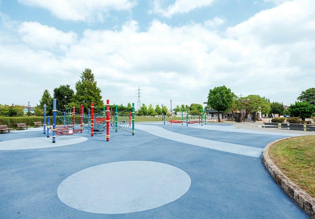 “大空のもと みんなのびのび 安全安心な広場”がコンセプトの公園。「子ども遊びエリア」にはロープとネットが入り組んだ大型遊具があり、登ったり寝転んだり飛び跳ねたりと自由に遊べます。広々とした「憩いのはらっぱ」ではピクニックやボール遊び、凧揚げも楽しめ、多世代が思い思いに過ごせる地域の交流スポットです。