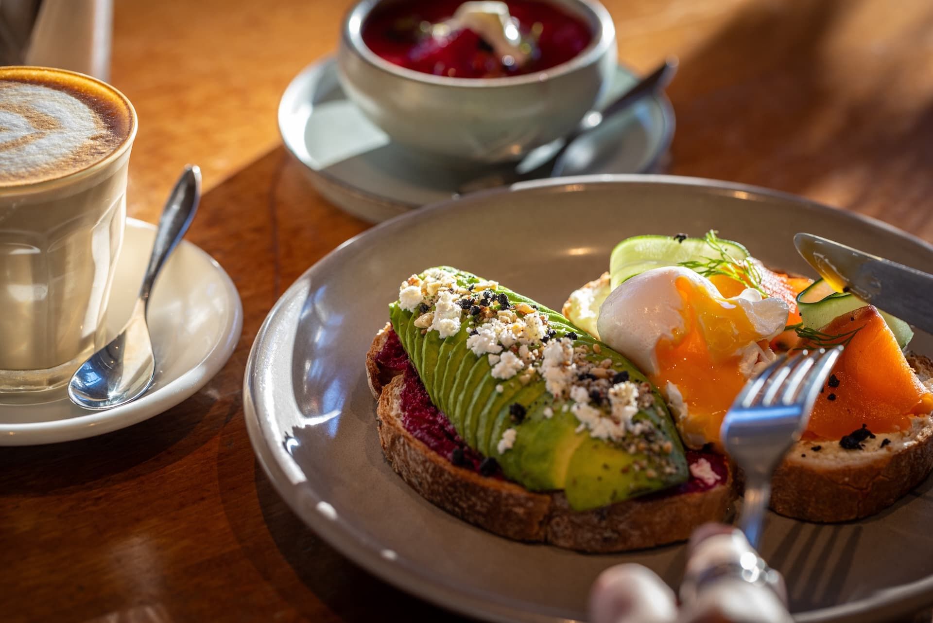 モーニングは8:00〜11:00の提供で、「ビッグブレッキー」などヘルシーでボリュームのあるメニューがそろいます。「スモーブロー(オープンサンド)」は「トリュフスクランブル」や「生ハムとマスカルポーネ ルビーカシスのソース」など定番の人気商品に加えて季節限定メニューも用意されており、毎回何を食べるか迷ってしまいそう。