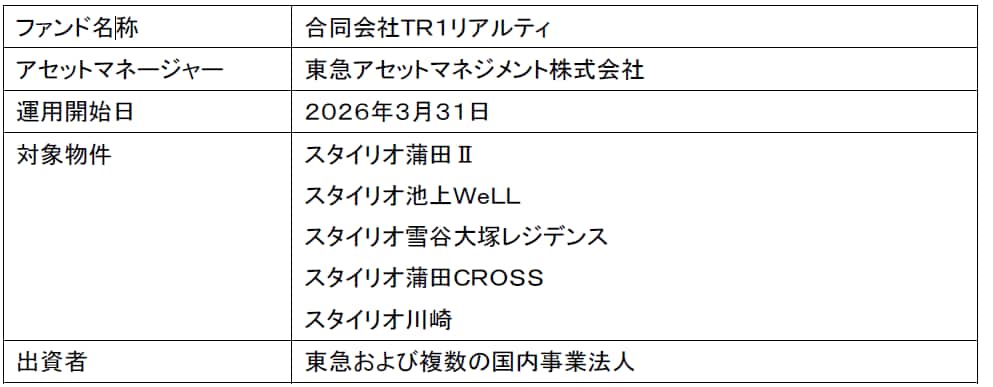 東急株式会社(以下、東急)および東急アセットマネジメント株式会社(以下、TAM)は、東急が東急線沿線を中心に展開する賃貸住宅ブランド「スタイリオ」シリーズの計5物件について、信託受益権化した上で、TAMが組成およびアセットマネジメント業務を受託する私募ファンド「合同会社TR1リアルティ」(以下、本ファンド)へ譲渡しました。本ファンドは、複数の国内事業法人を出資者として、2026年3月31日から運用を開始しています。