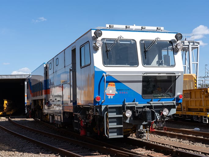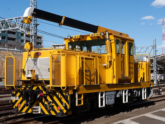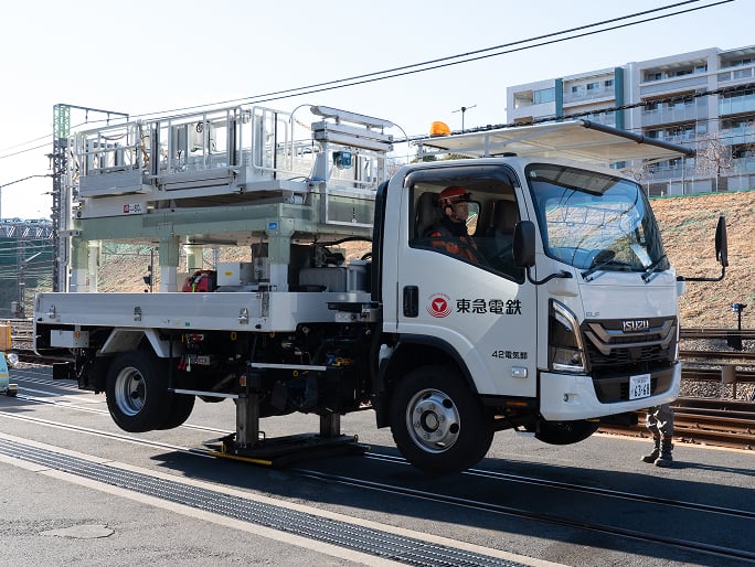 一般道路と軌道走行ができる特殊なトラックで昇降する作業台があり、主に架線関係の作業等で用いられます。軌道へはモーター基地や踏切から入線します。