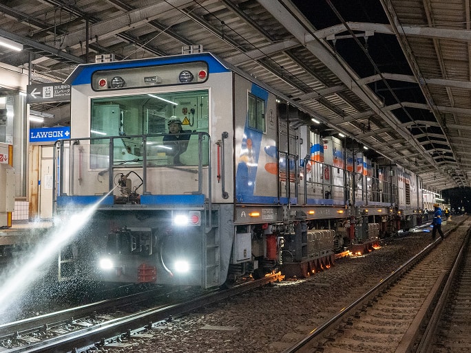 超音波レール探傷車(英記:Ultrasonic Search Trolley)は、夜間作業時間帯(終電後~始発まで)に当社鉄道線を走行し、レールの内部に発生した傷を超音波によって検知する保守用車で、レール折損などの事故を未然に防ぎます。