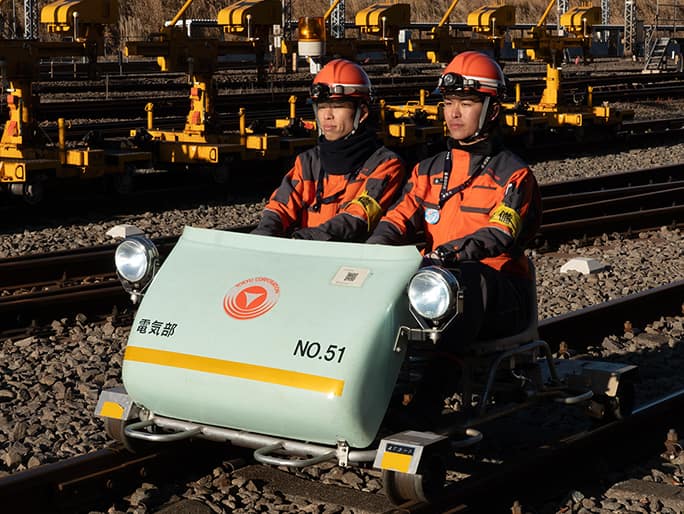 大規模災害発生時において、一般道路の通行が制限される場合などにおいて軌道カートを使用し迅速な設備点検を実施します。乗車定員は2名で容易に運搬が可能です。