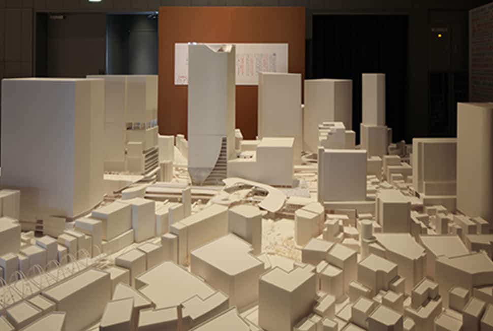 前川 プロジェクト数を計45点と半分強に絞り込み、「渋谷と益田」というテーマに特化したフロアを設けました。最大のポイントは、駅を中心に再開発が複数進行している渋谷の街の完成形が見られる1/200スケールの全体模型を新たに制作し、展示に加えたことです。事情によって正確に表現できなかった部分もありますが、大型開発がひと段落する頃、渋谷は概ねこうした姿になる、というイメージを体感していただくことを目指しました。建築設計が技術的な側面から始まって、最終的に建築物の完成を目指すのに対し、展覧会の設計は、建築の専門外の人々に対して“既存の情報の何を伝えたいか”を研ぎ澄まし、シンプルに伝える点が異なり、なおかつ難しい部分になります。失敗すれば、すぐに来場者数や反響の内容などに結果として現れるので、建築とはまた違う慎重さが求められ、気の抜けない仕事でした。