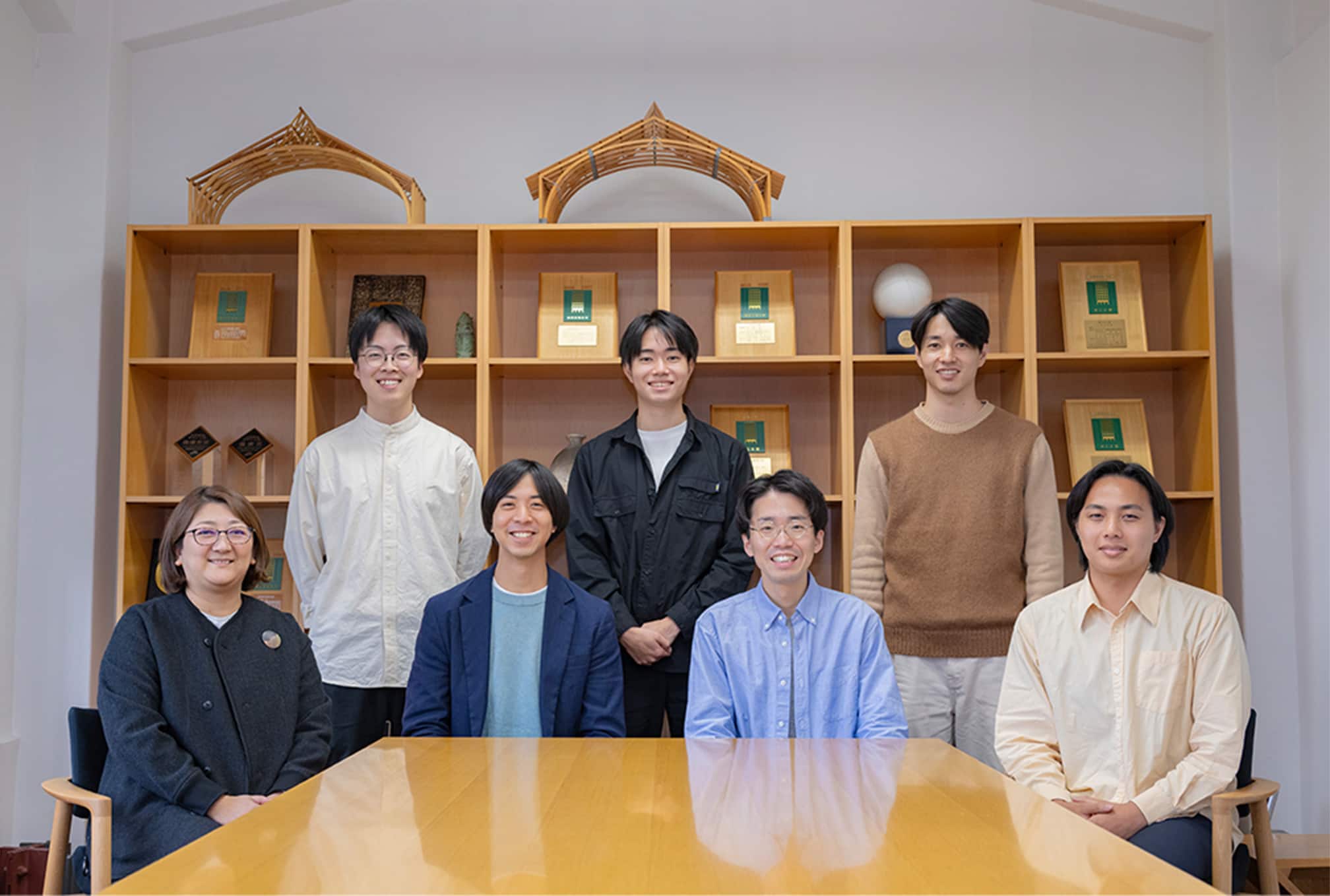 展覧会に携わった内藤廣建築設計事務所のスタッフたち(上段左より:仮屋さん、松田さん、坂田さん/下段左より:小田切さん、前川さん、東急 大木、山﨑さん)。