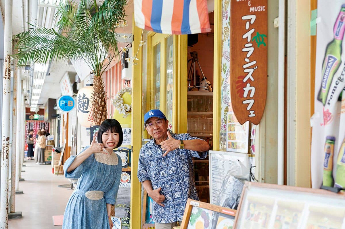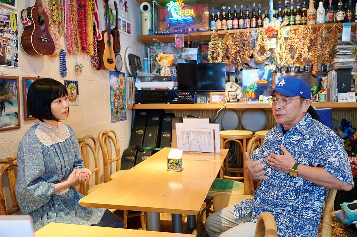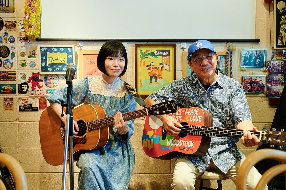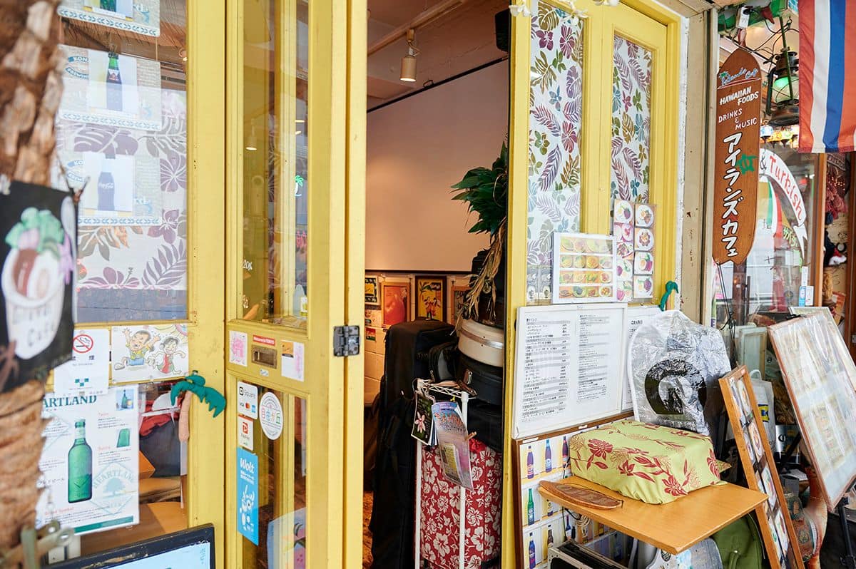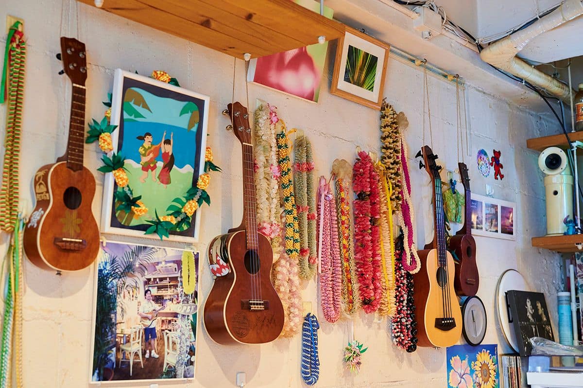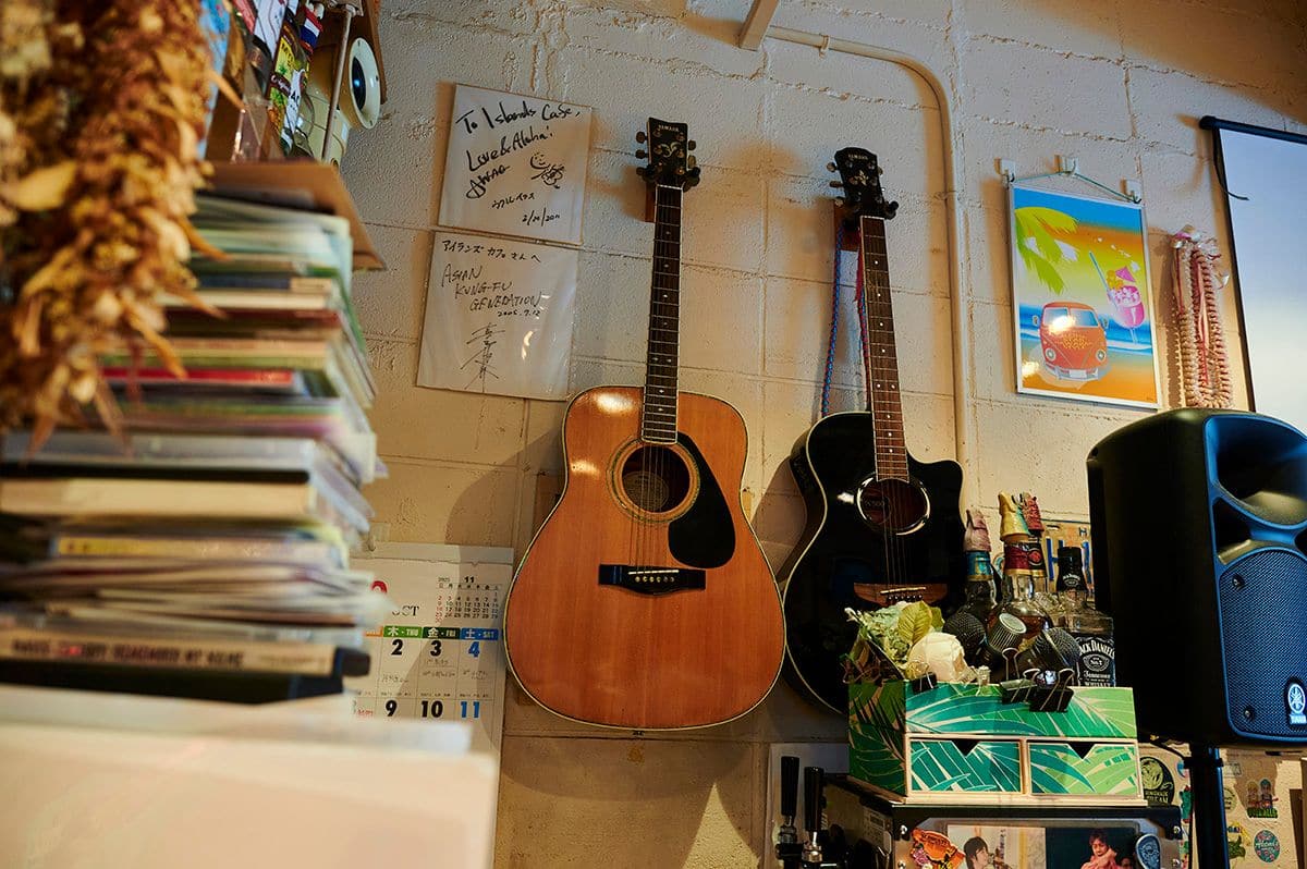 ハワイアン料理と音楽を楽しめる「アイランズカフェ」が店を構えるのも、そのあたり。入口の扉を開けると目に飛び込んでくるギター、アンプ、マイクスタンドといったスタジオさながらの設備に、にゃんぞぬデシさんの瞳がキラリと輝く。